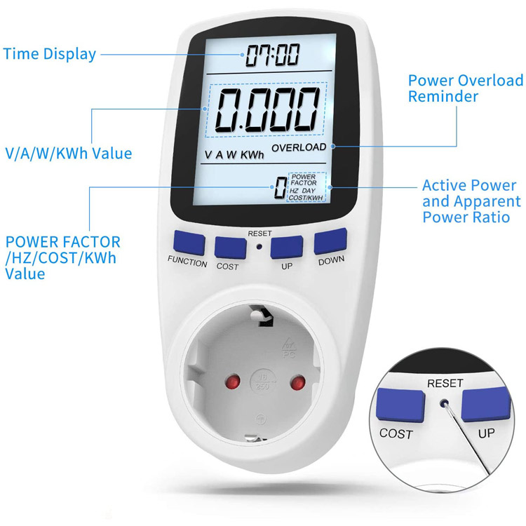 Real-time monitoring - Monitor electricity costs, press the COST, FUNCTION, UP and DOWN buttons to adjust electricity prices according to the instructions. You can monitor power consumption and electricity bills in real time. You can determine the cost of the standby device, the power factor whether the device is actually charged and the device is being charged more. Long time to reduce power consumption and save money.