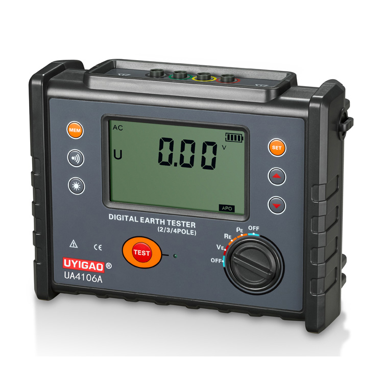 UA4106 digital earth-resistance tester is specially designed and manufactured for field measurement, adopting the latest digital and micro-processing technology, 3-pole or 2-pole method for earth resistance measurement, with a unique function of wire resistance verification, anti-interference capability and the ability to adapt to the environment, to ensure high precision, high stability and reliability for prolonged measure, which is widely used in electric power, telecommunications, meteorology, oil field, construction, lightning protection, industrial electrical equipment and other earth ground resistance measurement.
